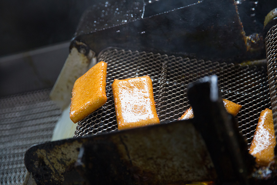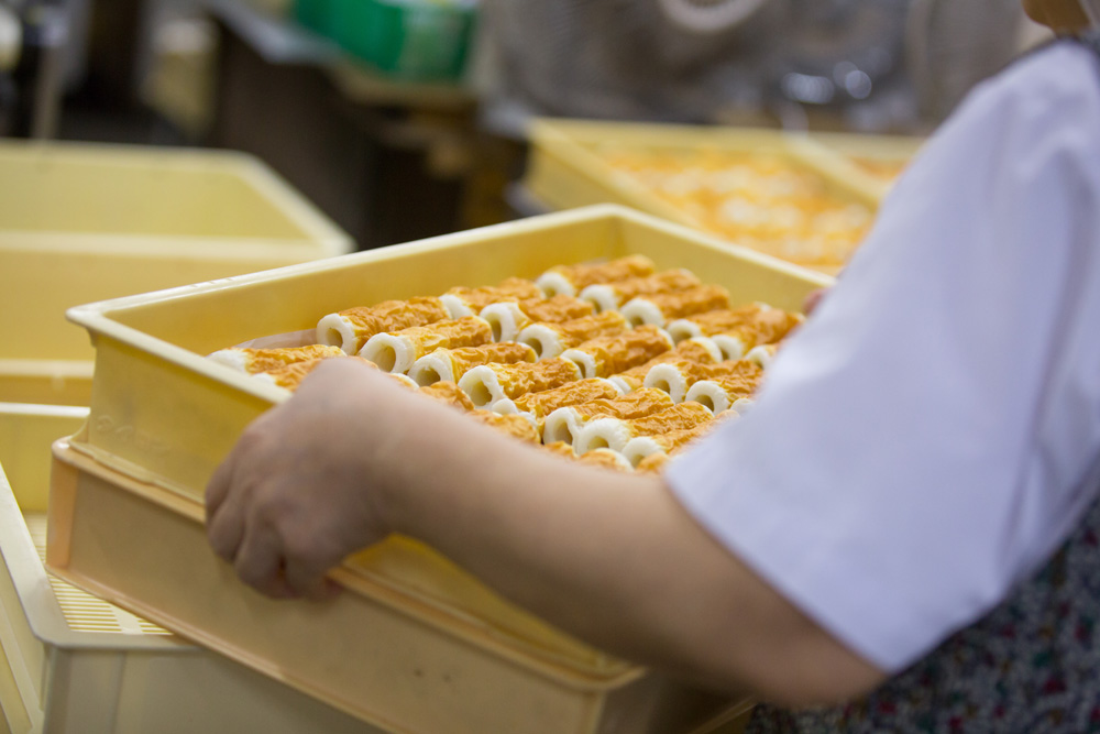 なぜ、職人が作るとおいしいのでしょうか。それは気温や湿度といった日々の変化をとらえて、塩を加減して、焼き時間、蒸し時間、揚げ時間を0.1秒単位で変えているからではないでしょうか。その職人の経験による加減が変わらぬおいしさとなっているのだと考えます。そのおいしさを安全にお届けするため、職人の健康管理をはじめ、素材や製品の鮮度管理や温度管理か、フライヤーなど製造機器の洗浄といった衛生管理、機器の消耗、破損の点検を徹底して行っています。