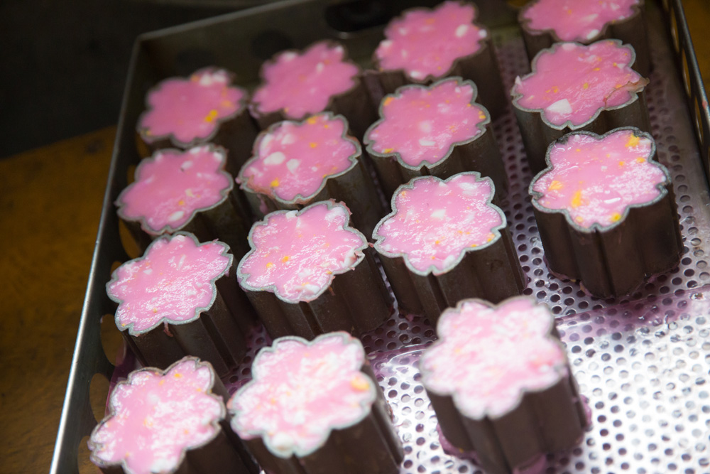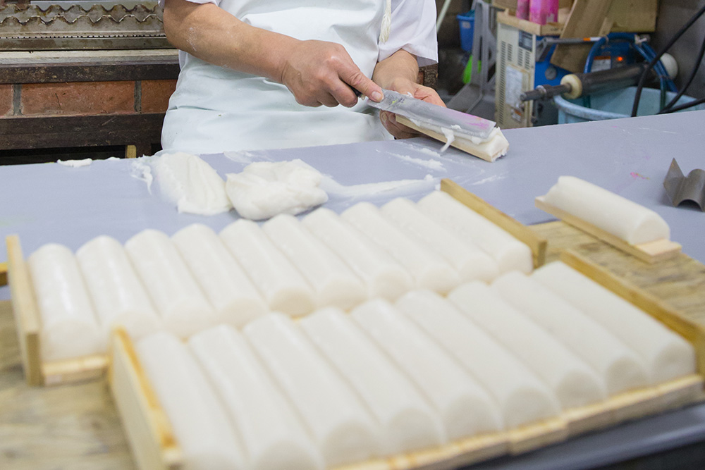 かまぼこやてんぷらのおいしさの基本は、魚、塩、水。てんぷらの場合は、油も加わります。それを技術や、経験や、創意工夫や、お客様の評価や、職人の感覚といったものを混ぜ合わせ、独自の製法として、練り、蒸し、焼いて、揚げてつくりあげます。シンプルだからこそ、味に差がでるのもかまぼこやてんぷらの特長です。だからこそ、魚は新鮮で良質なもの、旬を迎えたものをできるだけ選んでいます。塩は、用途に合わせて海洋深層水塩や天然塩を使用。いくつかの種類の塩を組み合わせ、加減を調整することで自然の甘みや旨さを引き出すことができます。水は水道水ではなく、四国山脈から湧き出る天然の地下水を使用しています。ミネラルを豊富に含んだおいしい水が旨さをいっそう引き出してくれます。そして、油は、良質のこめ白絞油を選んでいます。サラッとして、軽い風味があり、油っぽさが残らない高級な油です。